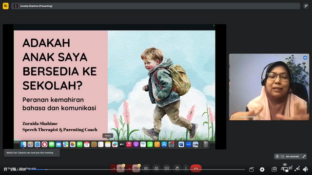 Sesi webinar kali ini telah dikongsi oleh Pn. Zuraida binti Ahmad Shahime yang merupakan Ahli Terapi Pertuturan. Dalam webinar ini, beliau telah menerangkan mengenai tanda-tanda anak bersedia dari segi bahasa, cara untuk meningkatkan sensori anak-anak, kemahiran bahasa yang membantu anak di sekolah dan intervensi awal untuk membantu perkembangan bahasa anak.