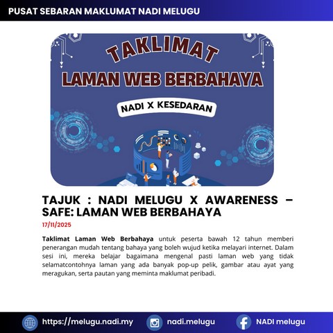 18 November 2025 | Aktiviti TerkiniTaklimat Laman Web Berbahaya untuk peserta bawah 12 tahun memberi penerangan mudah tentang bahaya yang boleh wujud ketika melayari internet. Dalam sesi ini, mereka belajar bagaimana mengenal pasti laman web yang tidak selamatcontohnya laman yang ada banyak pop-up pelik, gambar atau ayat yang meragukan, serta pautan yang meminta maklumat peribadi.