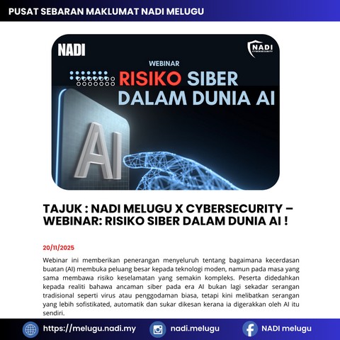 21 November 2025 | Aktiviti TerkiniWebinar bertajuk "Ancaman Siber dalam Dunia AI" telah diadakan pada 20 November 2025 melalui Zoom, khusus untuk ahli NADI. Webinar ini memberikan penerangan menyeluruh tentang bagaimana kecerdasan buatan (AI) membuka peluang besar kepada teknologi moden, namun pada masa yang sama membawa risiko keselamatan yang semakin kompleks. Peserta didedahkan kepada realiti bahawa ancaman siber pada era AI bukan lagi sekadar serangan tradisional seperti virus atau penggodaman biasa, tetapi kini melibatkan serangan yang lebih sofistikated, automatik dan sukar dikesan kerana ia digerakkan oleh AI itu sendiri.