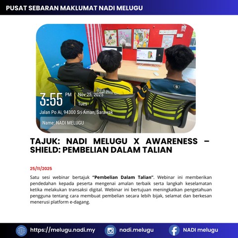 26 November 2025 | Aktiviti TerkiniSatu sesi webinar bertajuk “Pembelian Dalam Talian”. Webinar ini memberikan pendedahan kepada peserta mengenai amalan terbaik serta langkah keselamatan ketika melakukan transaksi digital. Webinar ini bertujuan meningkatkan pengetahuan pengguna tentang cara membuat pembelian secara lebih bijak, selamat dan berkesan menerusi platform e-dagang.