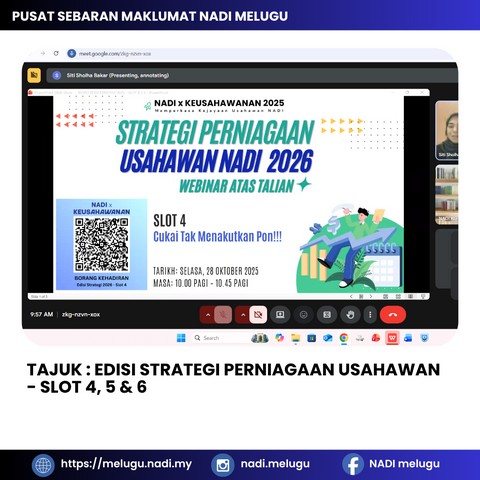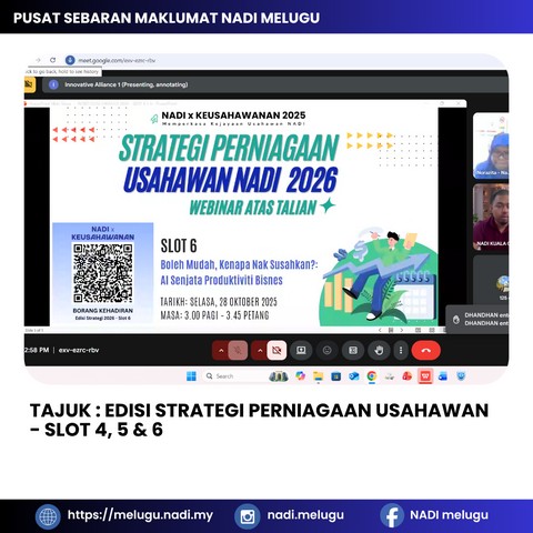 29 Oktober 2025 | Aktiviti TerkiniSatu sesi webinar NADI X Keusahawanan bertajuk Edisi Strategi Perniagaan Usahawan - Slot 4, 5 & 6 telah diadakan di Pusat Sebaran Maklumat Nasional (NADI) Melugu. Sesi ini memberi tumpuan kepada aspek cukai, cap dagangan dan penggunaan AI dalam produktiviti perniagaan:
