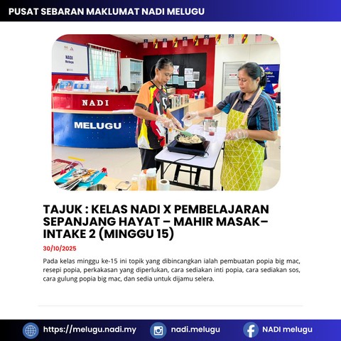 31 Oktober 2025 | Aktiviti TerkiniPada 30 Oktober 2025, dua orang peserta dari Pusat Sebaran Maklumat Nasional (NADI) Melugu telah menyertai sesi Kelas NADI Mahir iaitu Mahir Masak yang diadakan menggunakan platform Google Meet.