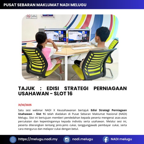 Satu sesi webinar NADI X Keusahawanan bertajuk Edisi Strategi Perniagaan Usahawan - Slot 16 telah diadakan di Pusat Sebaran Maklumat Nasional (NADI) Melugu. Slot ini bertujuan memberi pendedahan kepada peserta mengenai asas-asas percukaian dan kepentingannya kepada individu serta usahawan. Melalui sesi ini, peserta diterangkan tentang jenis-jenis cukai, tanggungjawab pembayar cukai, serta cara mengurus dan melapor cukai dengan betul.