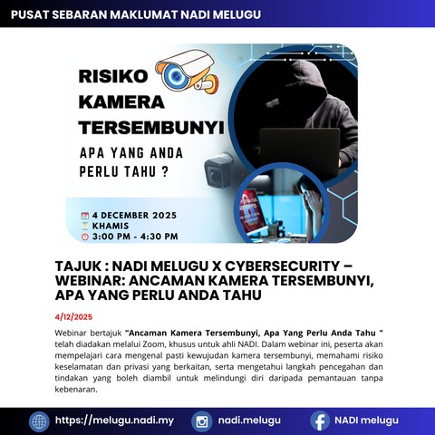 Webinar bertajuk "Ancaman Kamera Tersembunyi, Apa Yang Perlu Anda Tahu " telah diadakan melalui Zoom, khusus untuk ahli NADI. Dalam webinar ini, peserta akan mempelajari cara mengenal pasti kewujudan kamera tersembunyi, memahami risiko keselamatan dan privasi yang berkaitan, serta mengetahui langkah pencegahan dan tindakan yang boleh diambil untuk melindungi diri daripada pemantauan tanpa kebenaran.