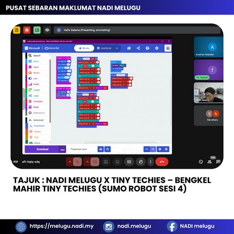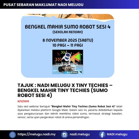 9 November 2025 | Aktiviti TerkiniSatu sesi webinar bertajuk “Bengkel Mahir Tiny Techies (Sumo Robot Sesi 4)” telah dijalankan melalui platform Google Meet. Dalam sesi ini, peserta didedahkan kepada asas pengaturcaraan dan teknik membina robot sumo, termasuk strategi kawalan, sensor, serta ujian pergerakan robot di arena pertandingan.