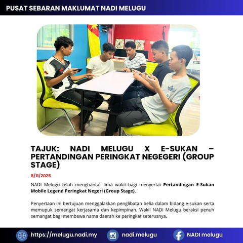 9 November 2025 | Aktiviti TerkiniNADI Melugu telah menghantar lima wakil bagi menyertai Pertandingan E-Sukan Mobile Legend Peringkat Negeri (Group Stage).