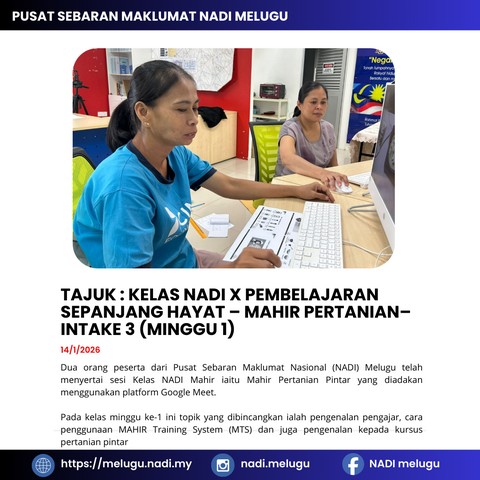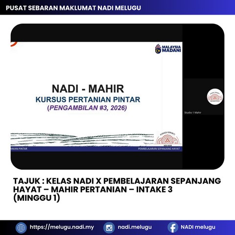 15 Januari 2026 | Aktiviti TerkiniDua orang peserta dari Pusat Sebaran Maklumat Nasional (NADI) Melugu telah menyertai sesi Kelas NADI Mahir iaitu Mahir Pertanian Pintar yang diadakan menggunakan platform Google Meet.
