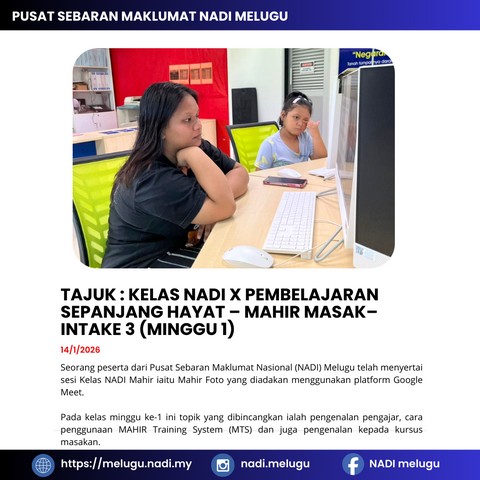 17 Januari 2026 | Aktiviti TerkiniSeorang peserta dari Pusat Sebaran Maklumat Nasional (NADI) Melugu telah menyertai sesi Kelas NADI Mahir iaitu Mahir Foto yang diadakan menggunakan platform Google Meet.